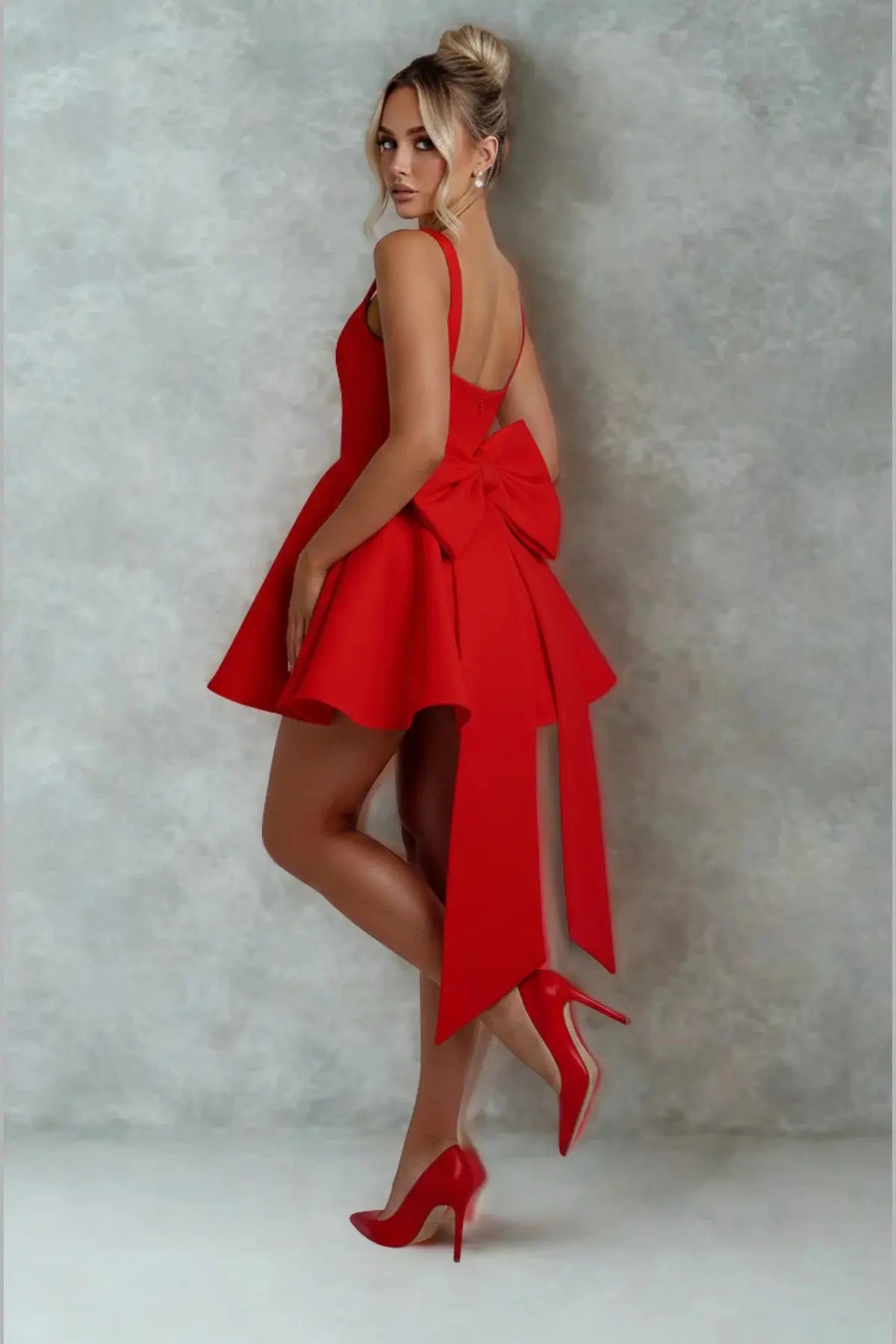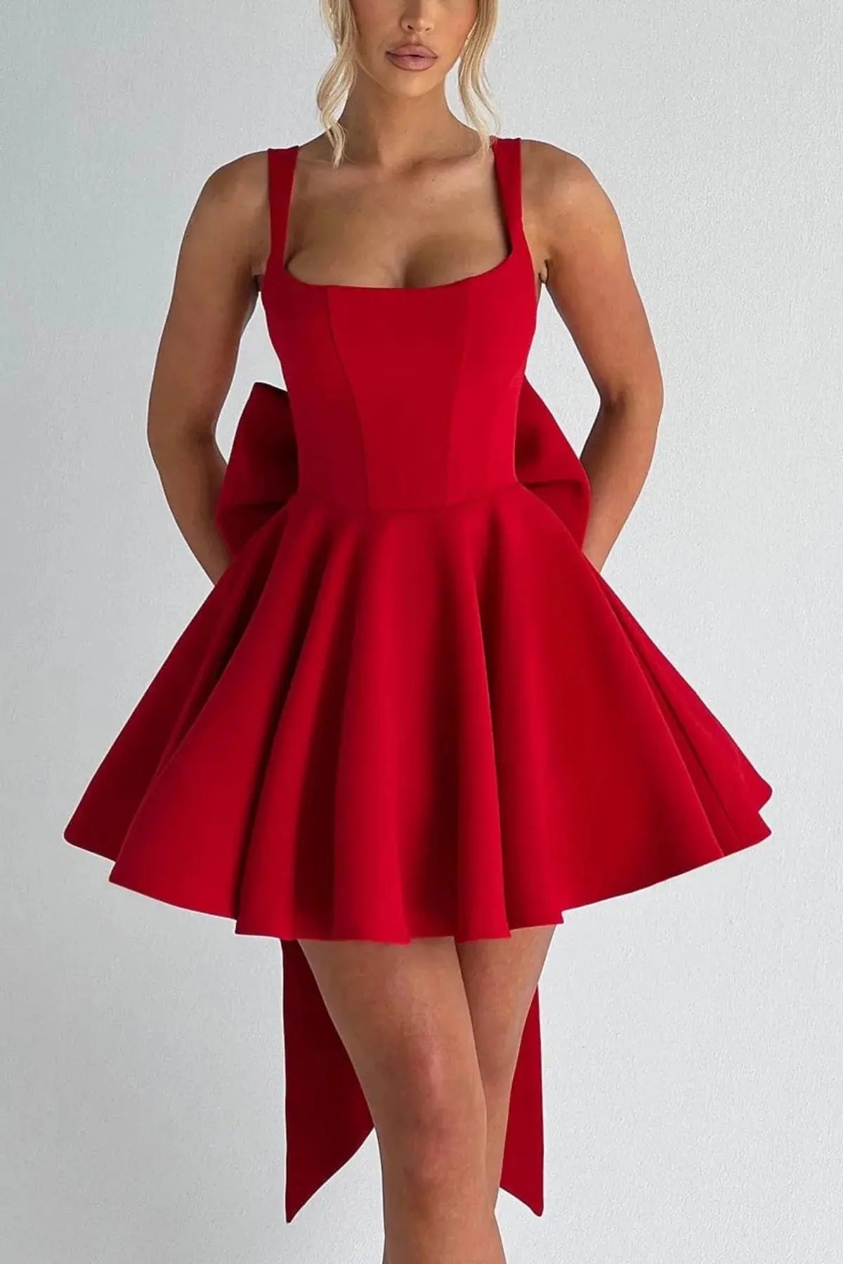 Graceful Square-Neck Bow Detail A-Line Mini Dress